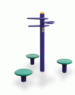 鍛煉方法:手握立柱把手,站在轉(zhuǎn)體盤上,向左右反復(fù)做轉(zhuǎn)體運(yùn)動(dòng)。